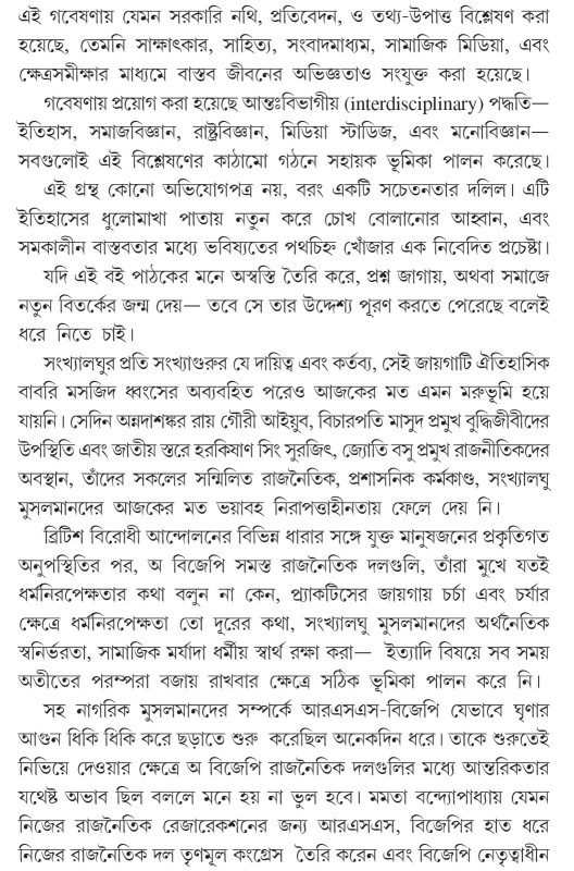 এই গ্রন্থটি ঠিক সেই রাজনৈতিক ও তাত্ত্বিক শূন্যস্থানে হস্তক্ষেপ করে। CAA-NRC প্রক্রিয়ায় আইন ও নৈতিকতার দ্বিধাবীক্ষণ, রাষ্ট্রনির্দেশিত হিংসা ও ঘেটোয়াইজেশনের আর্কিটেকচার, মুসলিম নারী-শরীরের উপর রাষ্ট্রীয় ভাষ্য নির্মাণ, এবং মিডিয়া ডিসকোর্সে 'দ্য হাইপারমার্জিনাল মুসলিম'-এর নির্মাণ—সবই এই বইয়ে উপস্থাপিত হয়েছে পোস্টকলোনিয়াল, সাবঅল্টার্ন ও ইসলামিক রাজনৈতিক চেতনার দৃষ্টিভঙ্গিতে।