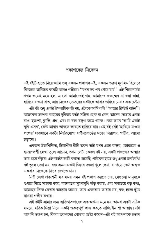 এ যেন শুধুই একটি বই নয়—এ এক ইসলামি অন্তর্জাগরণ, একটি আত্মা-জাগানিয়া দাওয়াত, যেখানে পাঠক আবিষ্কার করবেন জীবনের প্রতিটি চ্যালেঞ্জের বিপরীতে কুরআন-সুন্নাহর বর্ণাঢ্য আলো।